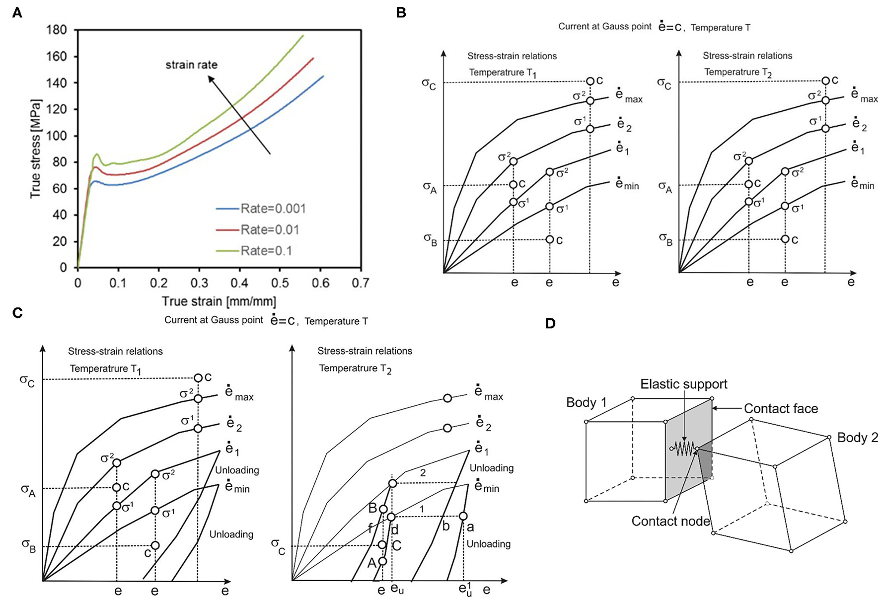 (A) Average tensile test results provided by BSL and strain rates, (B) Uniaxial stress-strain curves for different strain rates and one temperature, (C) with unloading curves, one unloading curve corresponds to each loading curve. (D) Interaction between solid bodies, two bodies in contact, and elastic support placed in contact point.