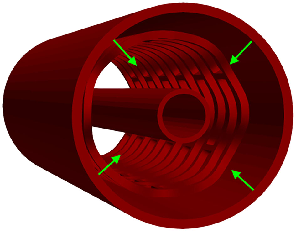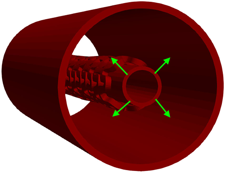 Although the in vitro experiment used the computer-controlled Nexus 500 syringe pump to inflate the stent, with an accuracy of 99.96%, and with the purpose to estimate the required diameter and achieve nominal recommended pressure during balloon inflation, the goal of this in silico test was to inflate the stent up to the nominal radius (32) of 3 mm to determine the effect of strut thickness and slots on characteristics of the stent. This was done with the use of cylinders (outer and inner), where the outer cylinder was compressed to simulate a realistic test. The central axis of the stent, in this simulation, was taken to be the Z-axis. The boundary condition for nodes at one side of the stent at z = Zmin was uZ = 0. To provide good numerical stability, we prescribed a very low speed of the inflation process. The stent was inflated by using prescribed pressures applied at the inner surfaces of the balloon (Figure 6). To provide realistic results, results obtained from the radial compression test were taken as an input together with residual stresses. Non-linear body interaction was set between the outer surface of the balloon and the inner surface of the stent.