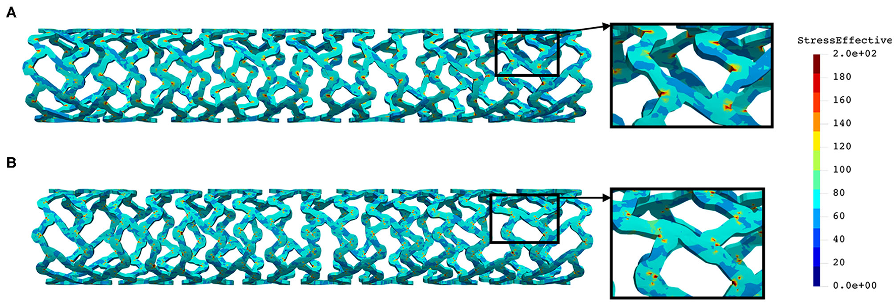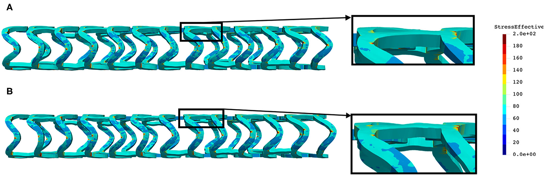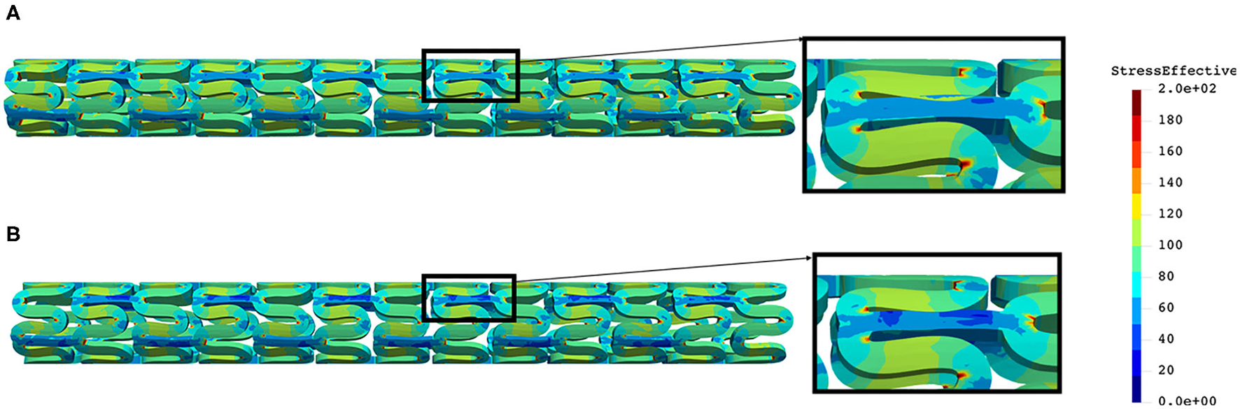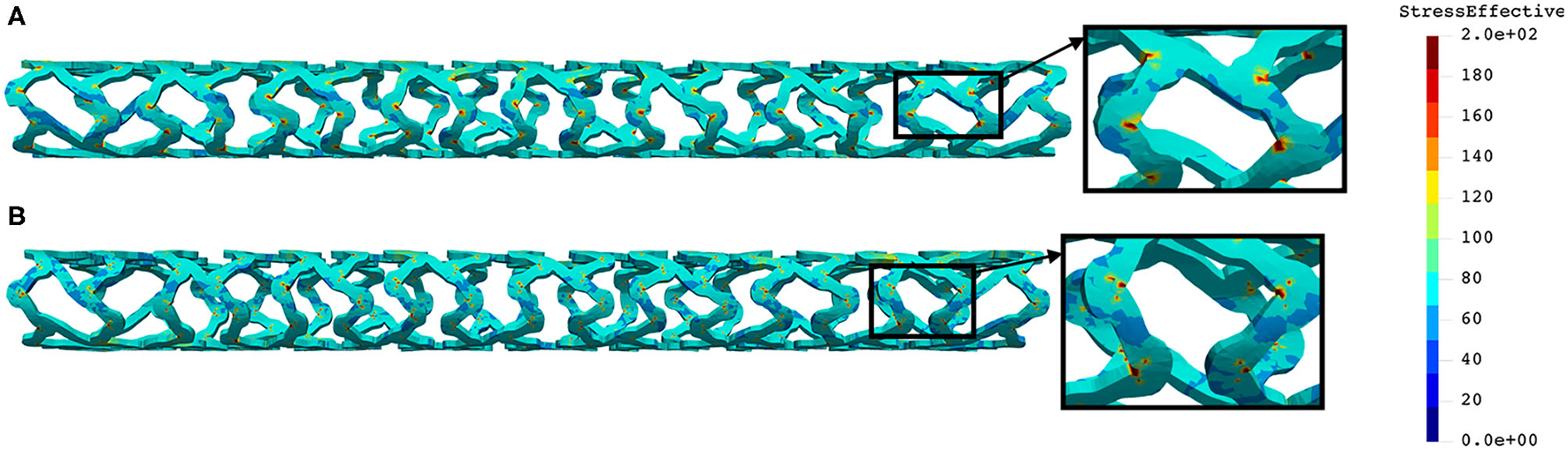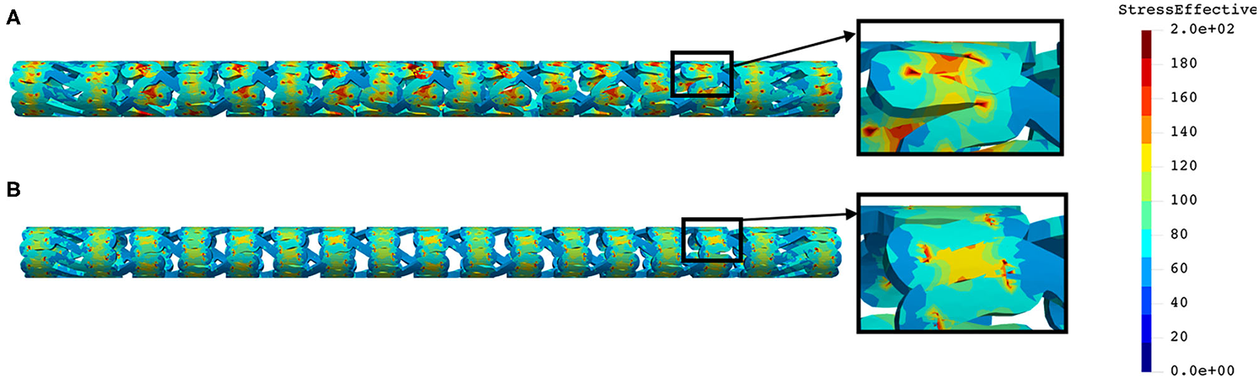The distribution of effective stress of the radial compression test for AB–BVS and AB–BVS-thinner stents are shown in Figures 4A,B, respectively, whereas the effective stress distribution for Renuvia–PLLA prot and PLLA prot-slots stents is shown in Figures 5A,B, respectively.