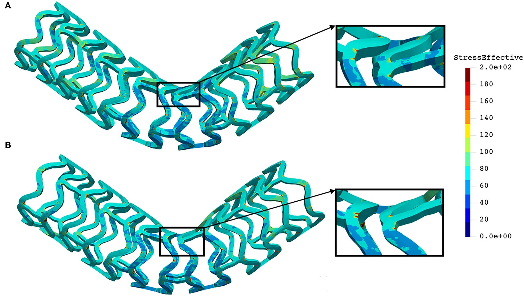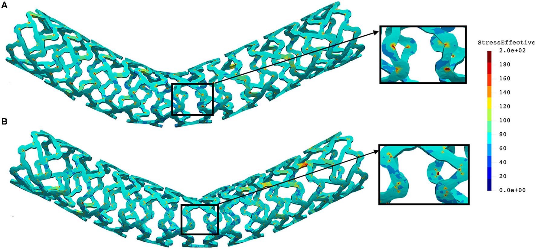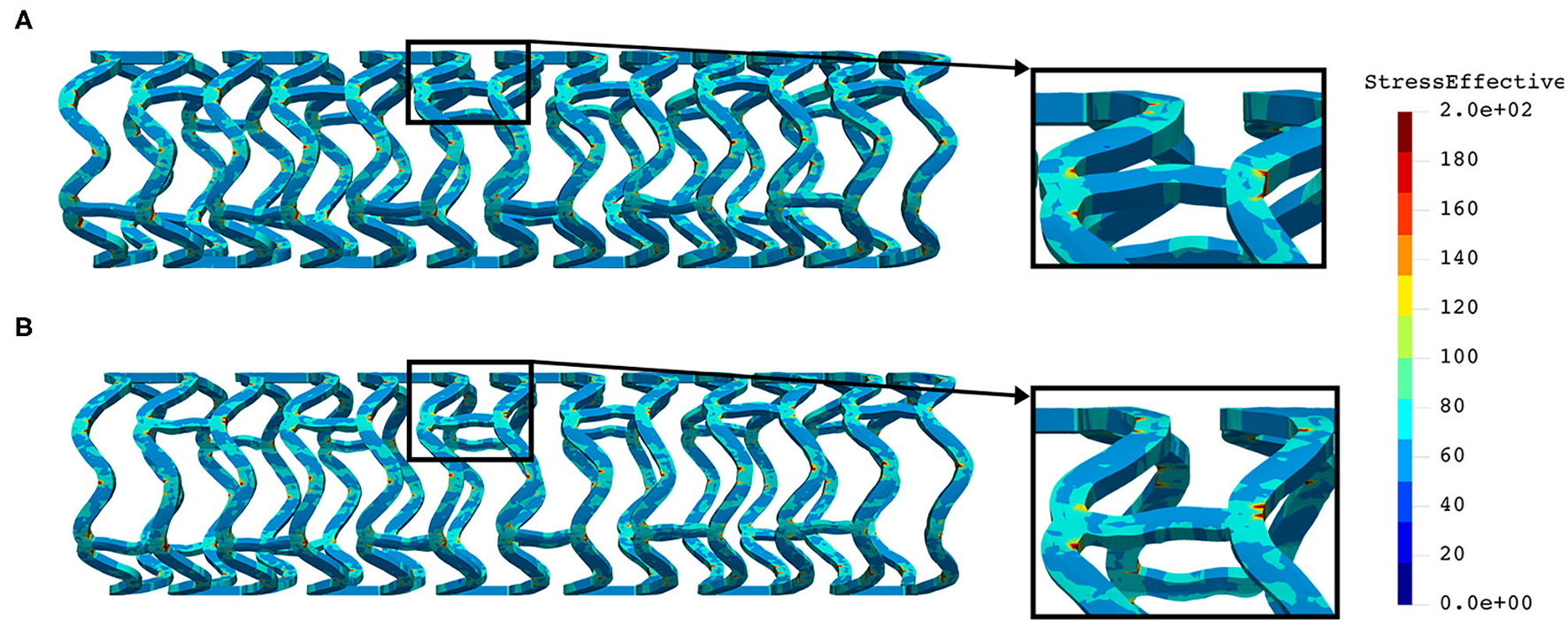 As can be seen in Figure 7, the lower thickness of strut in the inflation test resulted in lower concentrations of stress on struts, thus providing better structural integrity. We can notice in Figure 8 that additional slots on the stent (B) had no significant effect on effective stress distribution during the inflation test.