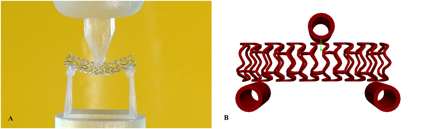 A three-point bending procedure, according to ASTM F2606 standard, was used to quantitatively characterize stent flexibility. The in vitro three-point bending test was performed on the axial load testing device AMETEK Brookfield machine with a displacement accuracy of 0.05 mm, equipped with a very precise low force load cell of 9.8 N (resolution of 0.00098N) and a specially designed tool for small size devices. The testing occurred in phosphate-buffered saline at 37°C and pH 7.4, and this is the condition that stands for the clinically relevant environment. The sample was fixed between three-point band fixtures (Figure 9A) and axially loaded by a machine compressing device at a localized point. During the whole process, the machine measured load and displacement.