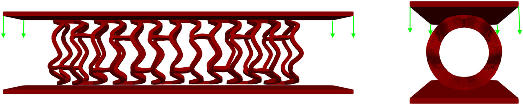 Boundary conditions of crush test. The stent is positioned between two plates: the top plate is loaded by uniform force while the bottom plate is fixed for displacements.