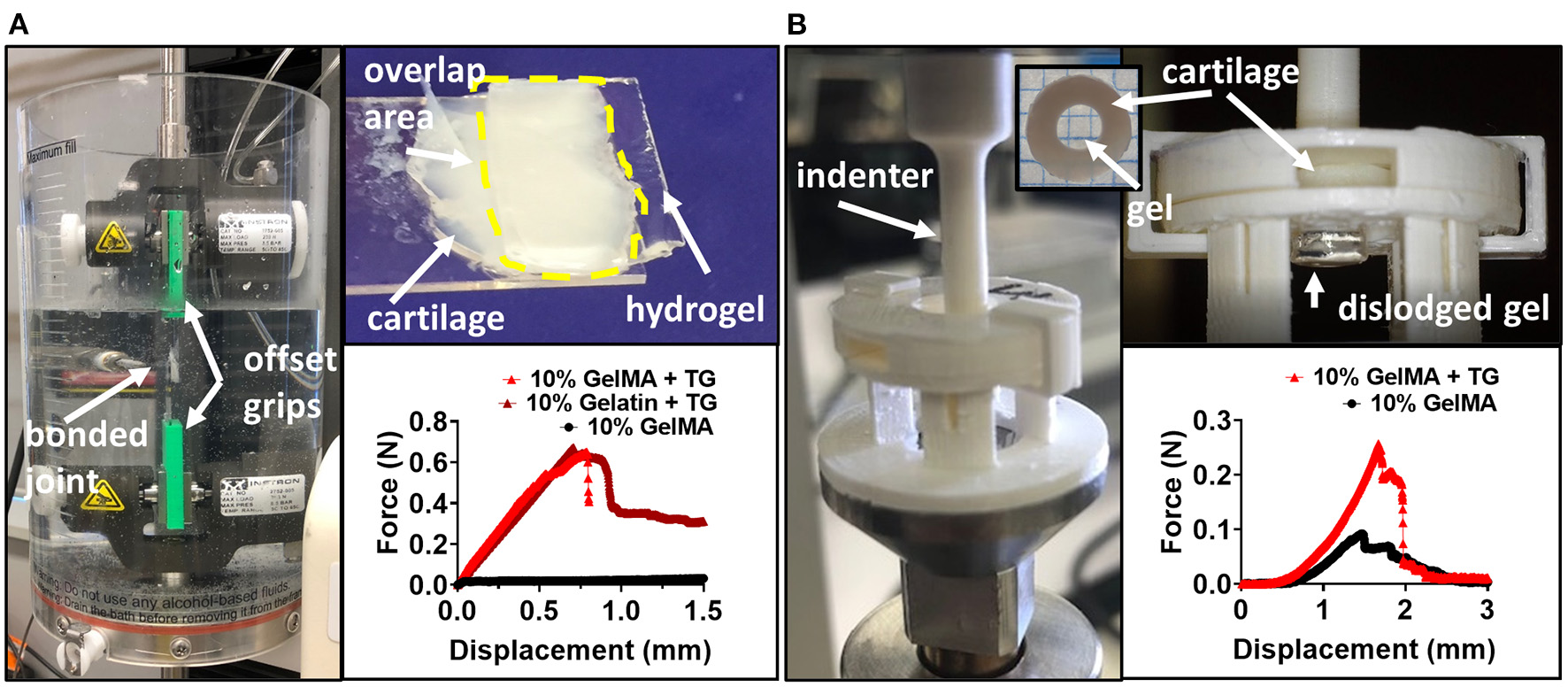 Testing the adhesive ability of GelMA with transglutaminase hydrogels against cartilage tissue (A) Pictures depicting lap shear test (left and top) and representative force-displacement curves for tests. (B) Pictures depicting ex vivo model and push out test (left and top), and representative force-displacement curves for tests with 10% GelMA. For representative force-displacement curves for 8 and 6% GelMA, see Supplementary Figure 5.