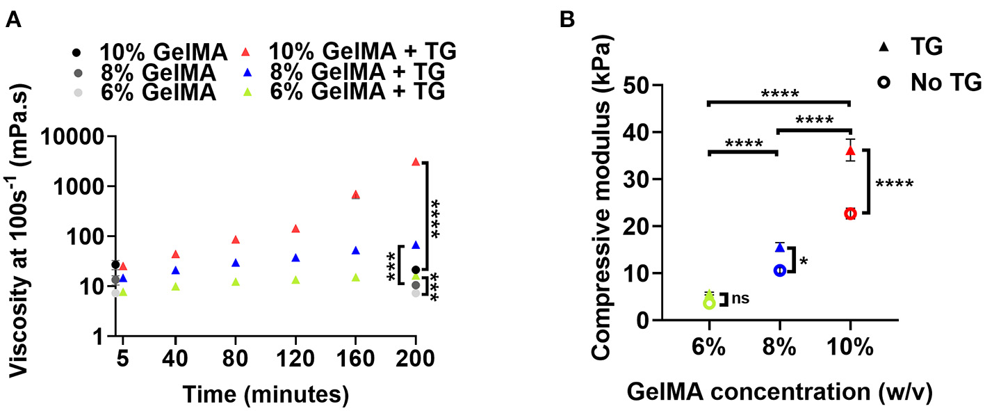 The viscosity of GelMA combined with transglutaminase was measured via rheology at a shear rate of 100 s−1 after different stages of incubation at 37°C to evaluate the time-dependent impact of transglutaminase on the material in the absence of photocrosslinking (Figure 2A). After addition of transglutaminase and 5 min incubation at 37°C to ensure a homogeneous solution, no significant difference between GelMA with transglutaminase and controls at the same polymer concentrations (at time point 0 min) was observed (unpaired t-tests with Bonferroni correction).