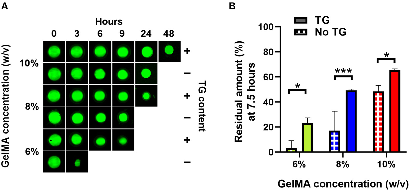 Enzymatic degradation of GelMA with and without transglutaminase at different substrate concentrations. (A) Fluorescence imaging of GelMA scaffolds at 10, 8, and 6% concentrations, without and with transglutaminase after incubation for different times in PBS containing collagenase type II (5 U/ml). (B) Residual amounts of scaffolds remaining after 7.5 h incubation calculated via cumulative loss of fluorescent material for GelMA scaffolds at three concentrations, both without and with transglutaminase. Data points are means with standard deviation for three scaffolds for each condition. Significance was assessed using a two-way ANOVA with Bonferroni post-hoc test. *p < 0.05, ***p < 0.001.