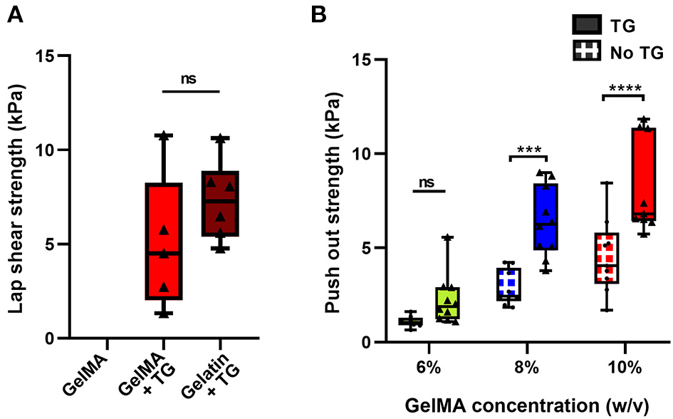 Quantification of the adhesive ability of GelMA with transglutaminase against cartilage tissue (A) Lap shear analysis of 10% GelMA with transglutaminase against bovine cartilage, in comparison to GelMA only and 10% gelatin with transglutaminase as controls. Individual data points are plotted with box and whisker plots indicating the median and interquartile ranges. Significance was assessed with an unpaired t-test. (B) Push out test results for three concentrations of GelMA with and without transglutaminase. Individual data points are plotted with box and whisker plots indicating the median and interquartile ranges. Significance was assessed with two-way ANOVA and Bonferroni post-hoc test. ***p < 0.001, ****p < 0.0001. Triangle symbols and solid shaded boxes are used to indicate samples that contained transglutaminase, and circle symbols with hatched boxes are used to indicate controls.