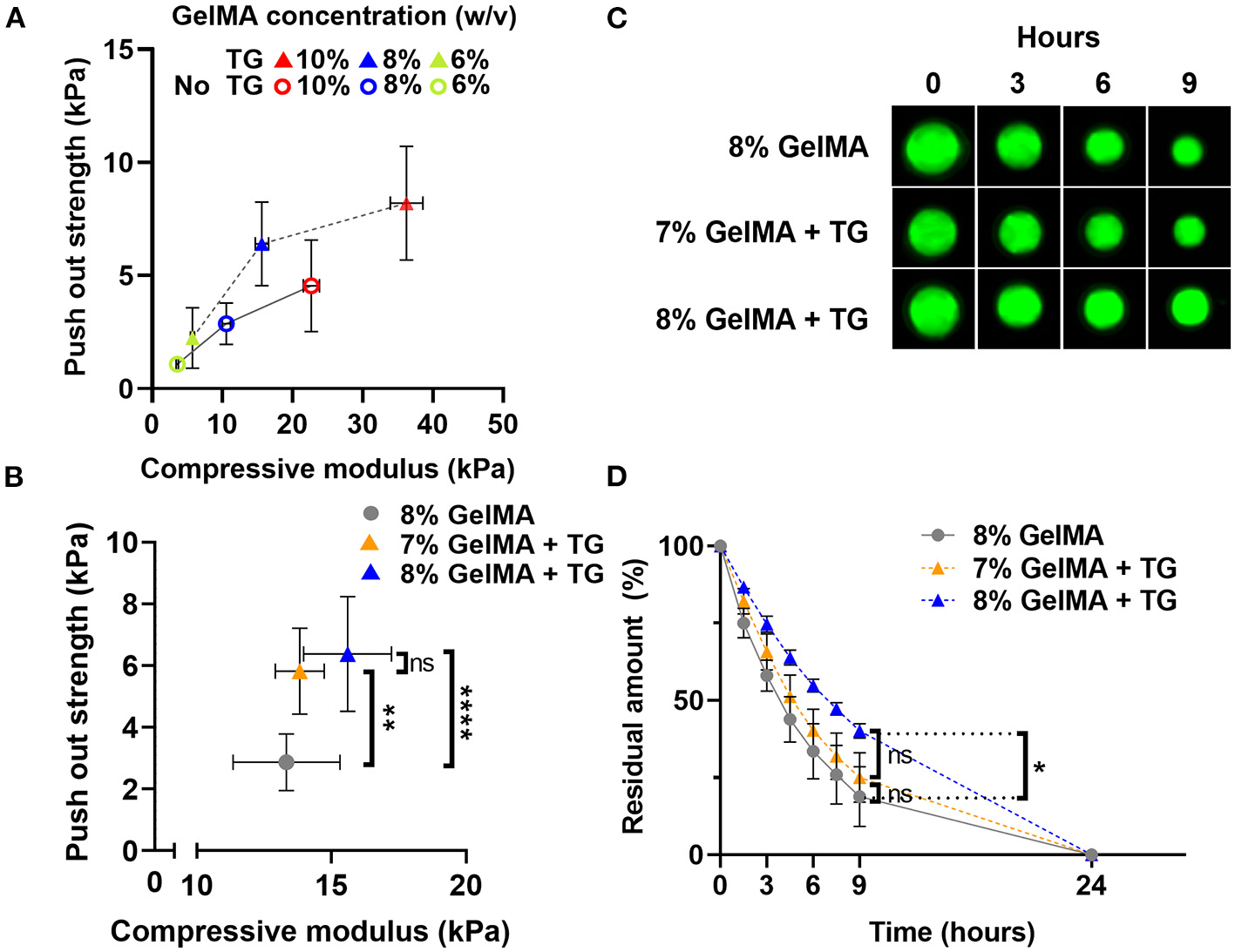 Interestingly, 8% GelMA + TG degraded at a similar rate to 10% GelMA over the first 9 h (and comparable amounts of scaffold remained after 7.5 h), despite 10% GelMA having significantly higher compressive modulus than 8% GelMA +TG (Figure 2B).