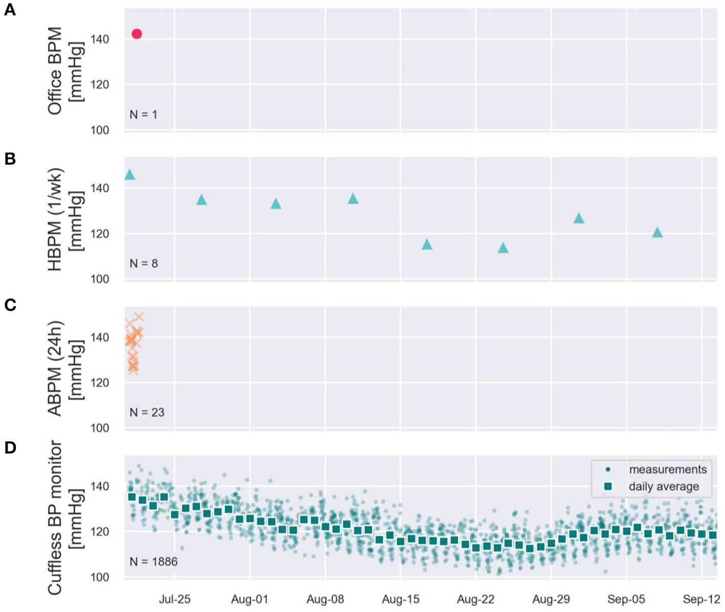 Even a motivated patient following a guideline-based measurement routine with HBPM usually does not provide more than 30 BP daytime readings/month, and cannot practically measure nocturnal BP (16). The intermittent nature of these readings makes HBPM generally unable to capture the variability of BP. A simulated example of this limitations of HBPM is provided in Figure 4. From a user wearing a continual cuffless BP device, 974 readings acquired over 1 month were used as a benchmark of real-world BP variability. The full dataset allowed accurate estimation of daytime (N = 701 readings) and nighttime (N = 175 readings) averages of SBP (133 mmHg and 131 mmHg respectively). From the same readings, we simulated the data that the patient would have brought to the provider from an HBPM device: the simulated HBPM measurements were constructed by randomly resampling the continual cuffless data following three typical HBPM measurement schedules (data selected only during daytime and at different periodicities). According to the illustrated simulation, the daytime averages of SBP would have been of 143 mmHg (measured 1/week), 140 mmHg (3/week) and 133 mmHg (2/day) respectively. In addition to the inaccuracy of the reported daytime averages, the HBPM-simulated readings would have also missed significant BP excursions (Day 21 and 22), unless the patient had been using the HBPM monitor daily.