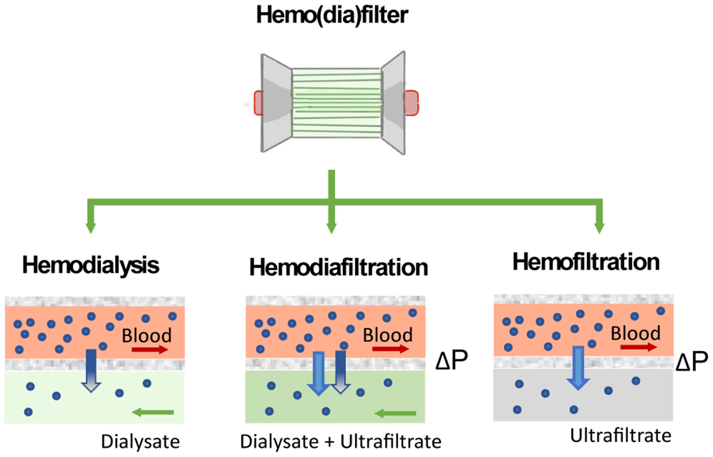 Figure 5. Solute clearance in renal replacement therapy can be achieved by diffusion or convection. In diffusion-based methods (hemodialysis), solutes move down their concentration gradient from the bloodstream to a dialysate solution. Methods based on convection (hemofiltration) apply a pressure gradient (ΔP) to force solutes and fluid flow across the filter.