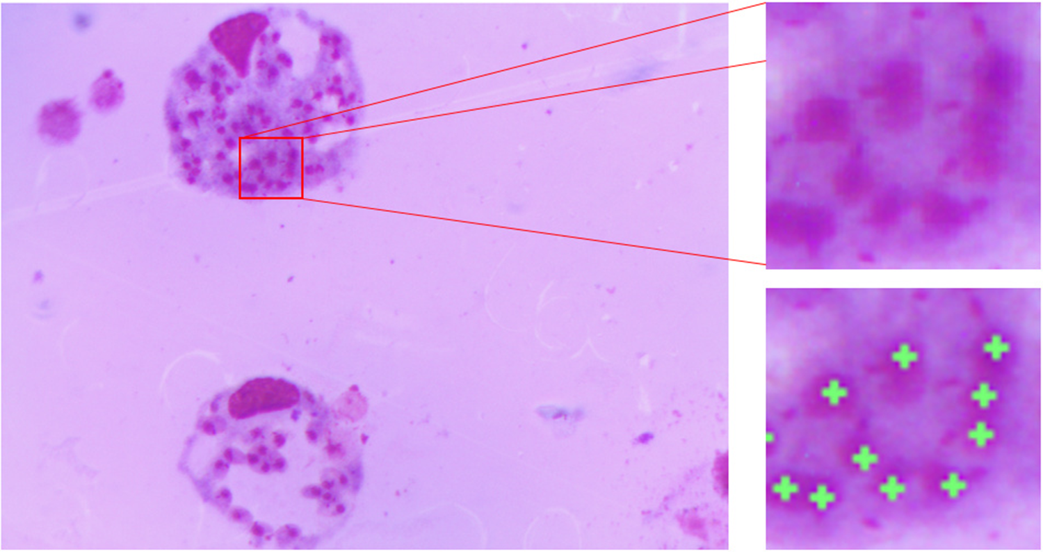 The image database was prepared at the Center for the Study of Chemical Bioactives (CBQ) at Universidad Central “Marta Abreu” de Las Villas (UCLV). The samples were prepared from in vitro peritoneal macrophages of BALB/c mice experimentally infected with Leishmania amazonensis and stained with Giemsa. The images were acquired with an Accu-Scope 3015 light microscope under a 100× objective (which combined with the camera lens results in a 50× optical magnification) with oil immersion and equipped with a 3.2-megapixel (MP) UCMOS03100KPA digital camera. Images were stored in a tagged image file format (tiff) with a resolution of 2,048 × 1,536 pixels. In this study, 46 images were captured. The ground truth images were prepared with the help of two experts from CBQ, who manually marked the locations of the amastigotes in each image. Figure 2 shows an image of macrophages infected with Leishmania parasites in which clumped amastigotes are magnified for better visibility. The green crosses in the locations of the amastigotes represent the ground truth annotations made by the specialist.