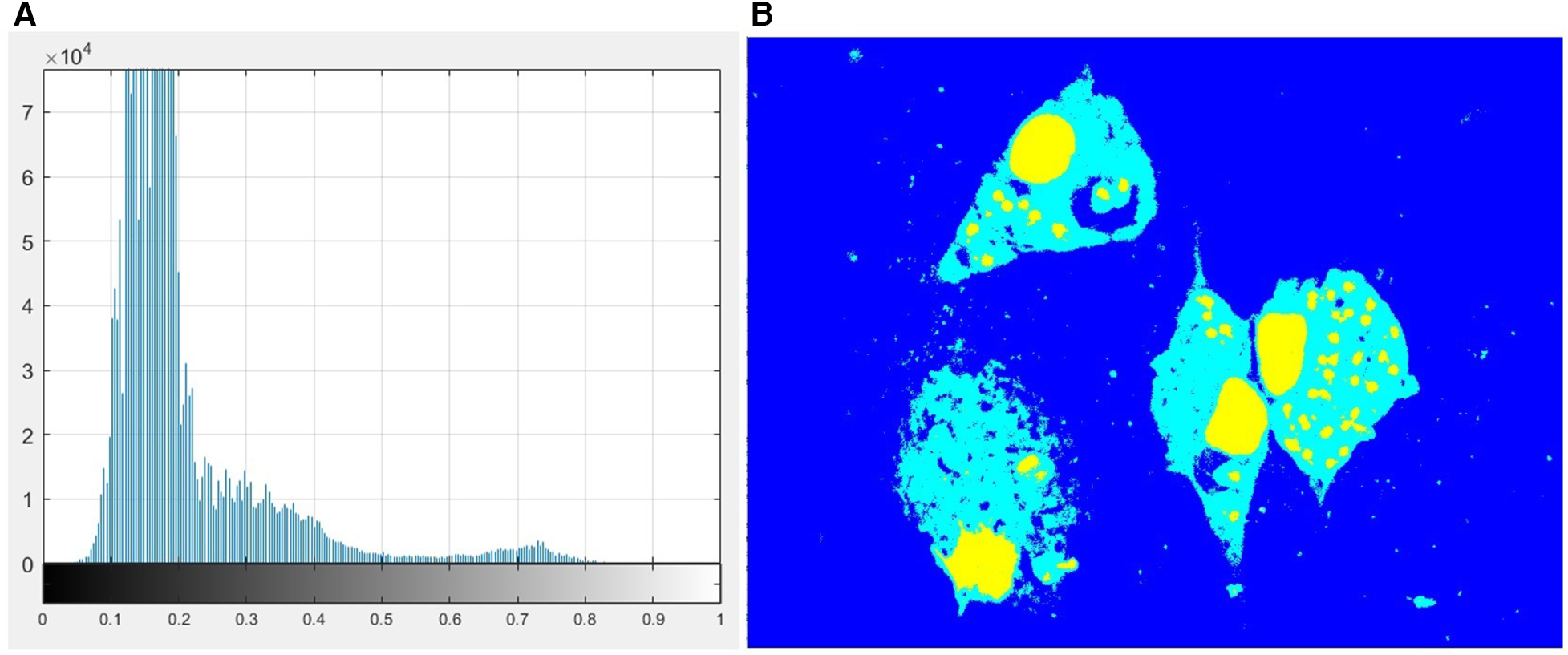 In this study, it was necessary to segment the following objects: the amastigotes and the nuclei and cytoplasm of macrophages. The S channel image was selected because it could show the differences between these parts clearly enough. Here, the nuclei and amastigotes appeared as the brightest region in the image; therefore, they could be deemed as belonging to a single class but could be differentiated by their dimensions afterward. The cytoplasm appeared as a slightly dark gray region and the background of the image was practically black. These image characteristics led us to propose a multilevel thresholding segmentation with two thresholds to separate these different regions into three classes.