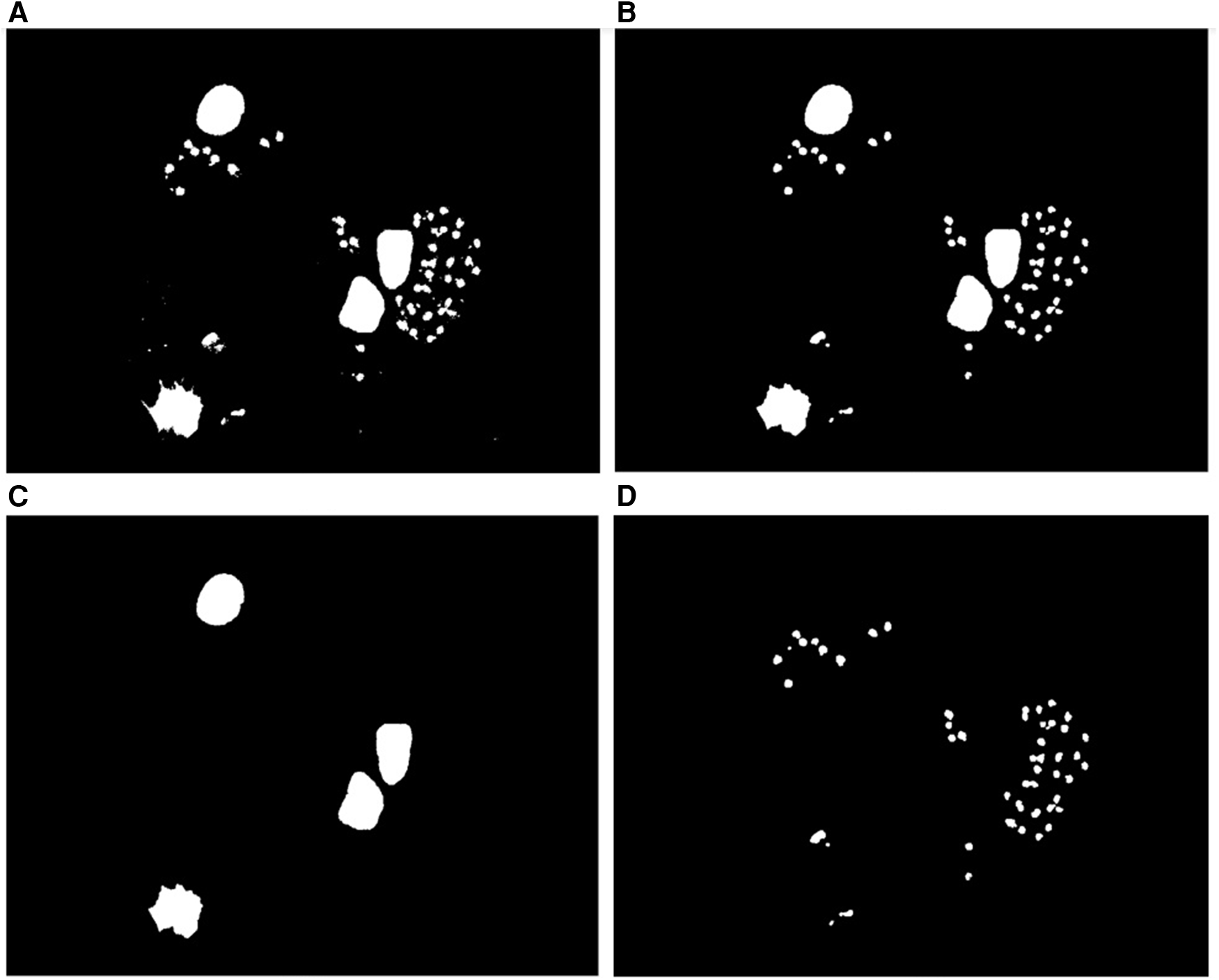 Nuclei segmentation. (A) Binary mask of the nuclei and parasite regions. (B) Binary mask of the parasite and nuclei regions after applying the morphological opening operation to fill holes and clear borders. (C) Binary mask of the nuclei regions. (D) Binary mask of the parasite regions.