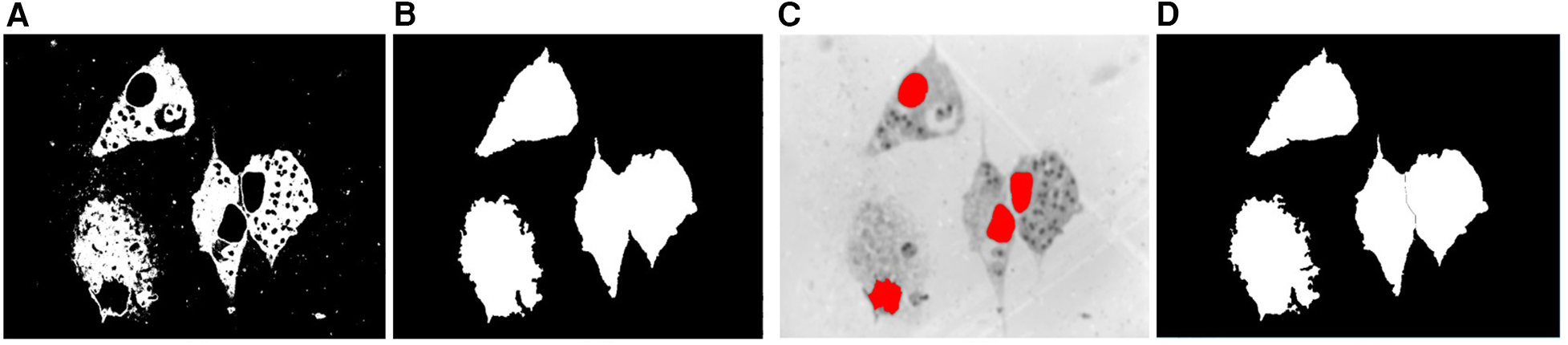 Cytoplasm segmentation. (A) Binary mask of the cytoplasm. (B) Binary mask after the morphological operations of hole filling and area opening. (C) Nuclei as internal markers on the complement of the Saturation image previously smoothed with a Gaussian filter. (D) Segmentation after applying the watershed transform.