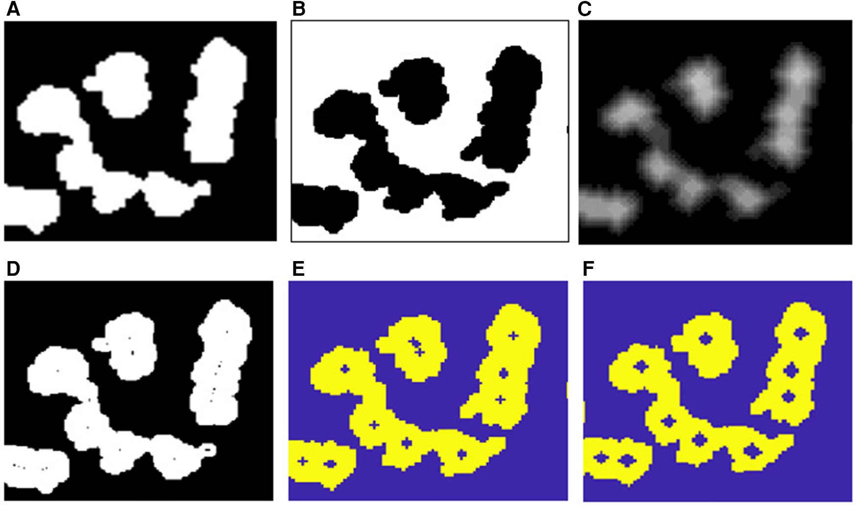 To split overlapped objects, first, the image of Figure 7A is complemented, as shown in Figure 7B, and then, its distance transform (DT) is computed, as illustrated in Figure 7C. The DT of a binary image can be defined as the distance from every pixel to the nearest non-zero-valued pixel (24). The result of DT is a grayscale image that shows its highest intensity in a point or patch, which is in general a regional maximum, located farthest from the background. Then, the obtained grayscale image is normalized to the range [0 1]. This image is called Idt here.