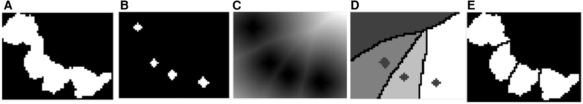 (A) Binary image of a cluster of amastigotes. (B) Regional maxima after morphological filtering. (C) WEDT. (D) Internal and external markers. (E) Split cluster.