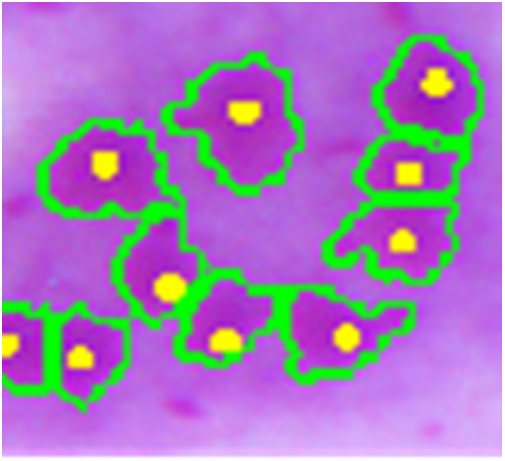 Amastigote contour detection (green) and reference ground truth marks (yellow).