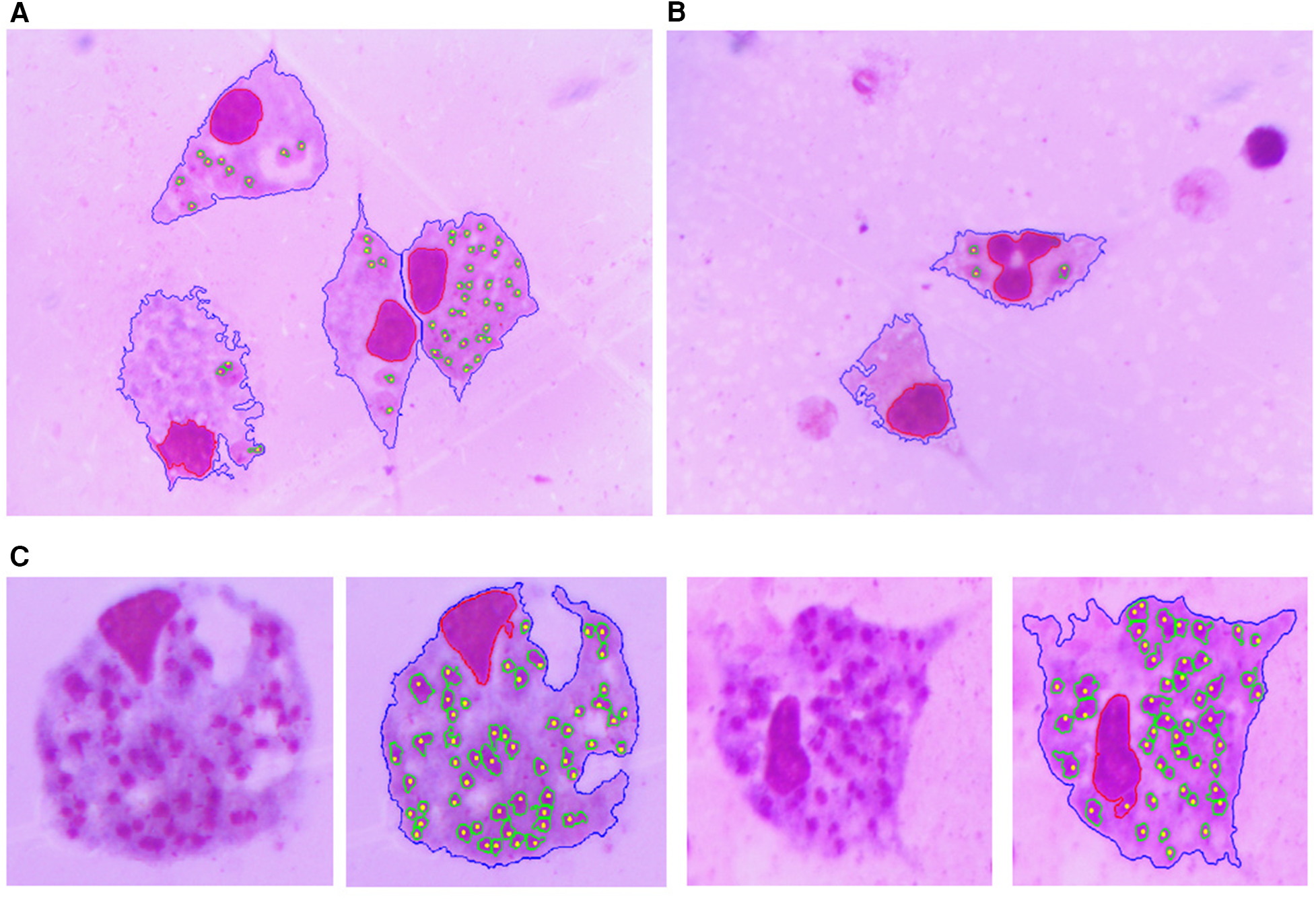 Neves et al. (11) proposed a method for counting macrophages and parasites in fluorescent images of Leishmania-infected macrophages based on blob detection, clustering, and separation using concave regions of the cells’ contours. They used 24 images and achieved a precision of 81.55% ± 1.09, a recall of 87.62 ± 0.93, and an F-measure of 84.48 ± 0.60 in the parasite detection, achieving a better performance than those reported by Leal et al. (12) and Nogueira (13).