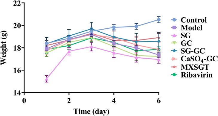 Mice may experience a decreased appetite and subsequent weight loss during viral infections. As illustrated in Figure 3, the mice in the blank (Control) group exhibited a gradual increase in weight. After modeling on day 3, mice in all other groups showed a weight decrease. Notably, by day 6, the body weight of treated mice in the ribavirin, MXSGT, and SG-GC groups, which have antiviral efficacy, showed a slight increase.