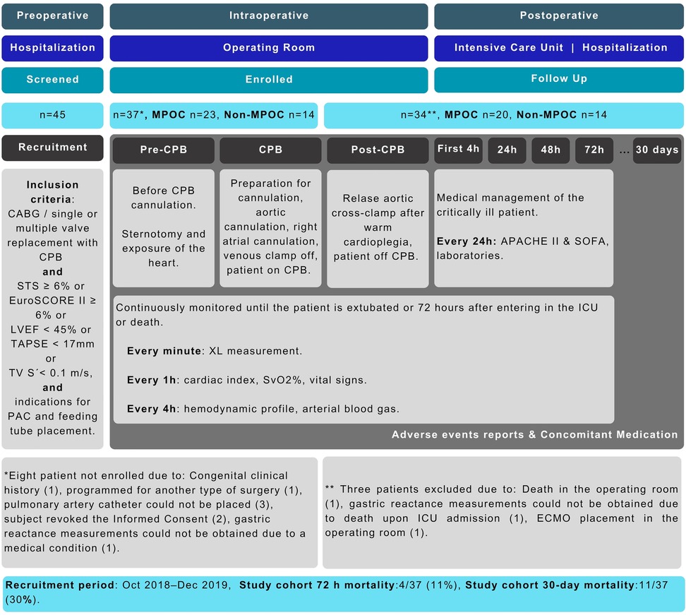 Figure 1. Study design and STROBE flowchart. APACHE II, acute physiology and chronic health evaluation; CABG, coronary artery bypass graft; CPB, cardiopulmonary bypass; EuroSCORE II, European system for cardiac operative risk evaluation II; ICU, intensive care unit; LVEF, left ventricular ejection fraction; MPOC, major postoperative complications; PAC, pulmonary artery catheter; STS, society of thoracic surgeons; SOFA, sequential organ failure assessment; SvO2, mixed venous oxygen saturation; TAPSE, tricuspid annular plane systolic excursion; TV S', systolic peak velocity of the lateral ring of the tricuspid; XL, gastric reactance.