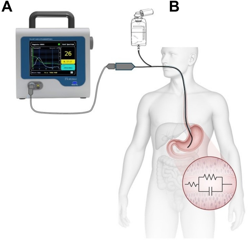 Figure 2. Mucosal impedance measurement system (MIMS). (A)—bedside monitor; (B)—sample applications in humans with a feeding tube fitted with an impedance sensor.