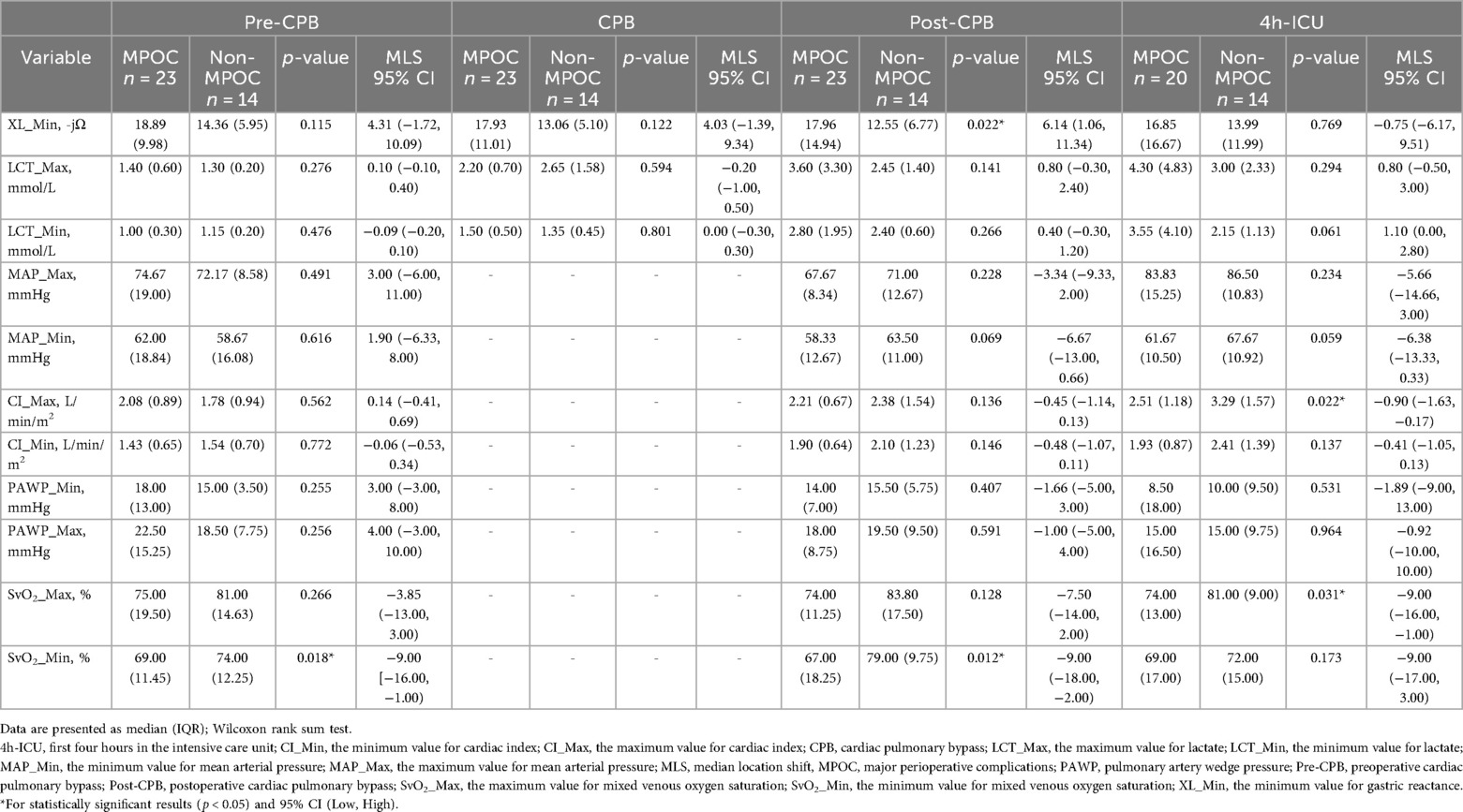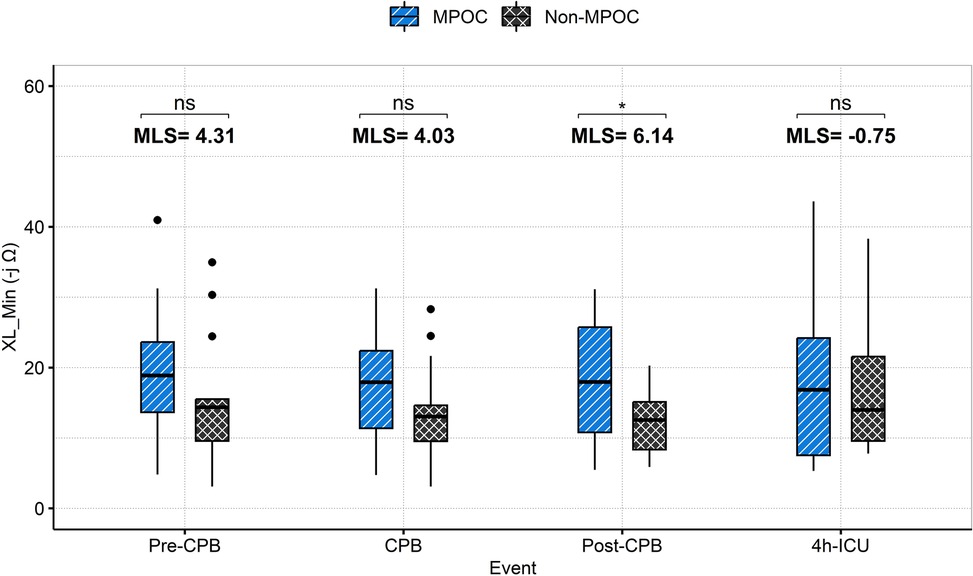 Figure 3. Intraoperative (pre-CPB, CPB, post-CPB) and postoperative (4h-ICU) events comparison for MPOC and Non-MPOC changes in XL_Min. *for statistically significant results (p < 0.05). CPB, cardiopulmonary bypass; ICU, intensive care unit; MLS, median location shift; MPOC, major perioperative complications; ns, non-significant, XL_Min, the minimum value for gastric reactance.