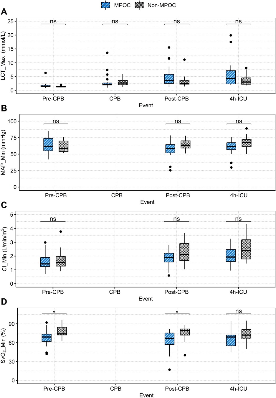 Figure 4. Intraoperative (pre-CPB, CPB, post-CPB) and postoperative (4h-ICU) event comparison for MPOC and Non-MPOC changes in (A) LCT_Max, (B) MAP_Min, (C) CI_Min and (D) SvO2_Min. *for statistically significant results (p < 0.05). CI_Min, the minimum value for cardiac index; CPB, cardiopulmonary bypass; ICU, intensive care unit; LCT_Max, the maximum value for lactate; MAP_Min, the minimum value for mean arterial pressure; MPOC, major perioperative complications; ns, non-significant; Pre-CPB, preoperative cardiac pulmonary bypass; Post-CPB, postoperative cardiac pulmonary bypass; SvO2_Min, the minimum value for mixed venous oxygen saturation.