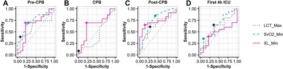 Figure 5. ROC analysis in XL_Min at intraoperative (pre-CPB, CPB, post-CPB) and postoperative (4h-ICU) events. CPB, cardiopulmonary bypass; ICU, intensive care unit; XL_Min, the minimum value for gastric reactance.
