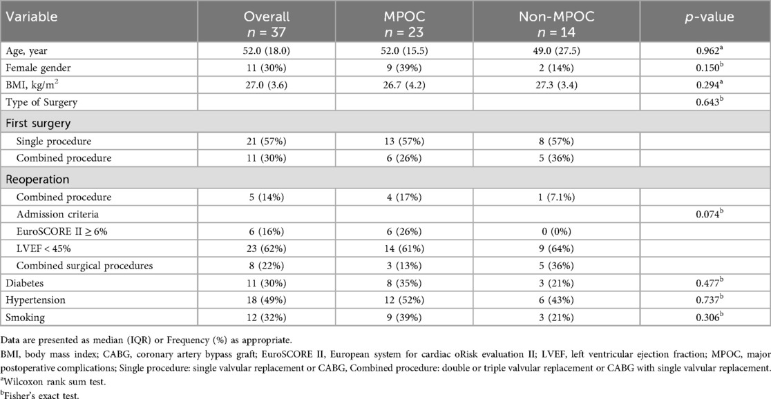 Within the study cohort, the 72 h mortality rate was 11% (4/37), and the 30-day mortality rate was 30% (11/37). MPOC occurred in 62% of patients (23/37), including bleeding (35%), cardiogenic shock (22%), and vasoplegic syndrome (5%). The remaining 38% (14/37) did not develop MPOC (Non-MPOC group). The mortality rate among patients with MPOC was 48% (11/23), with all deaths associated with at least one additional complication.