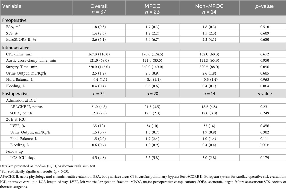 In the postoperative phase (Table 2), upon ICU admission, the MPOC group exhibited a higher APACHE II score (21.5 points, corresponding to a 30% probability of hospital mortality) compared to the Non-MPOC group (18.5 points, 12% probability of hospital mortality). The SOFA score reflected an 80% probability of mortality in both groups (scores of 12.5 and 12.0, respectively). Heart failure with reduced ejection fraction (HFrEF, defined as LVEF <40%) was observed in both groups at the 24 h postoperative phase. Additionally, the MPOC group exhibited greater oliguria than the Non-MPOC group. Postoperative bleeding showed statistically significant differences between the groups [median (IQR), 1.0 (0.9) L, p < 0.001], indicating a higher mortality risk in the MPOC group (1).