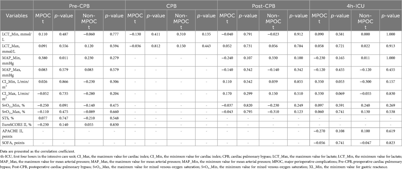 Table 3 presents the median (IQR), MLS with 95% CI [Low, High], minimum, and maximum values of key variables by event and group. SvO₂_Min was statistically significant during the pre-CPB event; XL_Min and SvO₂_Min were significant during the post-CPB event; and CI_Max and SvO₂_Max were significant during the 4-hour ICU period. Table 4 details the correlation coefficients of key variables, stratified by group and event. No statistically significant differences were observed.