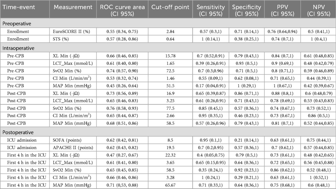 Table 5 summarizes the ROC analysis for key variables across different time points. Specifically, post-CPB, XL_Min demonstrated good predictive performance with an AUC of 0.73 (95% CI: 0.56–0.89), sensitivity of 0.65, and high specificity of 0.86. SvO2_Min showed even higher sensitivity at 0.85 and an AUC of 0.76 (95% CI: 0.58–0.93), reflecting strong discriminatory ability. Other variables, including LCT_Max, CI Min, and MAP Min, exhibited moderate predictive accuracy, with AUCs ranging from 0.65–0.68. Overall, these findings underscore XL_Min and SvO2_Min as the most reliable predictors of post-CPB morbimortality in this cohort.