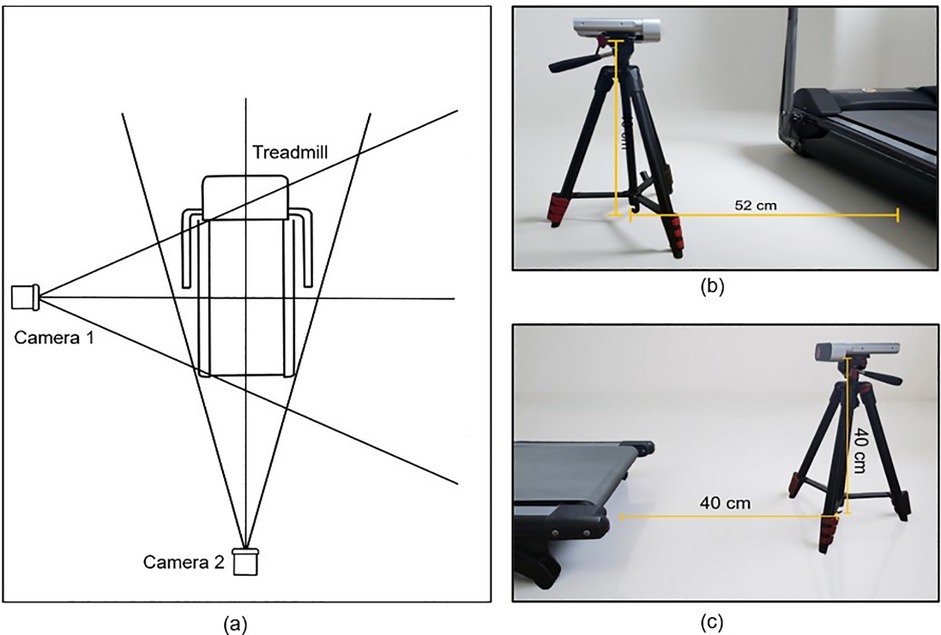 Figure 1. Camera placement. (a) Schematic placement of the cameras for KineFeet recording of the right foot, (b) Microsoft Azure Kinect Camera mounted on tripod at 40 cm height above the ground with a distance of 52 cm facing the left side of the treadmill, and (c) set the camera behind the treadmill with a distance of 40 cm.