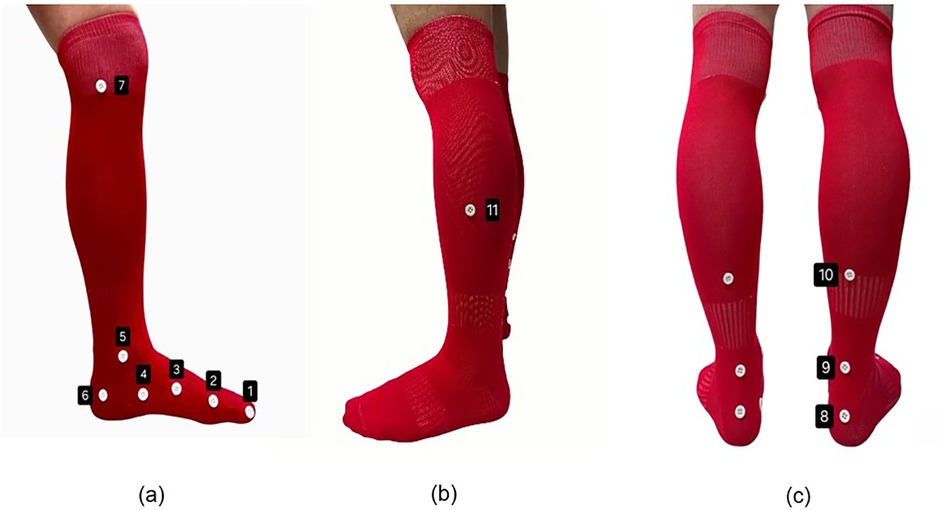 Figure 2. Placement of markers. (a) Medial side; (1) first distal interphalang joint, (2) head of first metatarsal, (3) in the middle of navicular tuberosity and head of first metatarsal on first metatarsal shaft, (4) navicular tuberosity, (5) medial malleolus, (6) calcaneal tu- berosity, (7) knee joint line, and (b) posterior side; (8) achilles tendon attachment, (9) on a line with medial malleolus, (10) gastrocnemius musculotendinous junction, and (c) on the lateral side of (11) half of a calf.