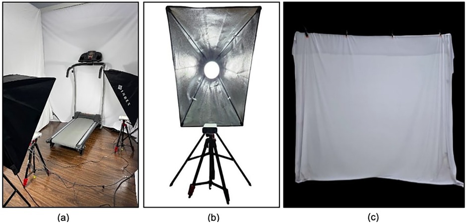 Figure 3. Workspace for kineFeet. (a) Gait analysis room set for Kinefeet recording, (b) placement of camera and studio light, and (c) white backdrop.