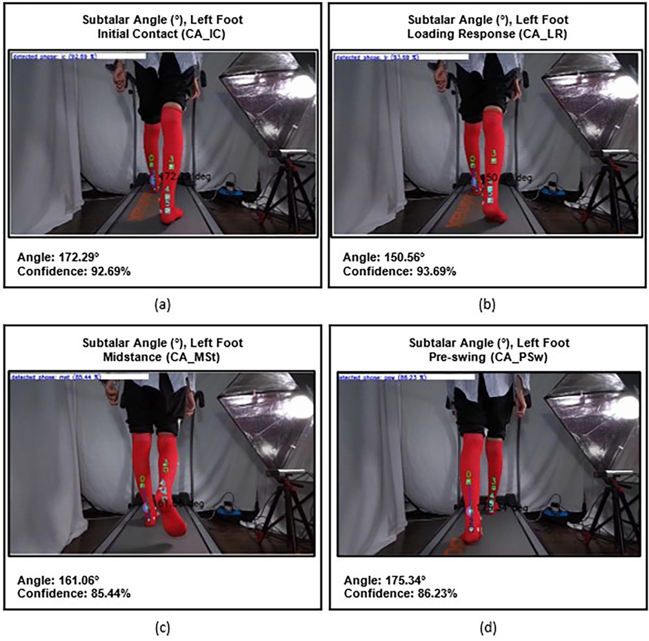 Figure 5. Subtalar angles of the left foot at different gait phases: (a) initial contact (CA_IC), (b) loading response (CA_LR), (c) midstance (CA_MSt), and (d) onset of pre-swing (CA_PSw).