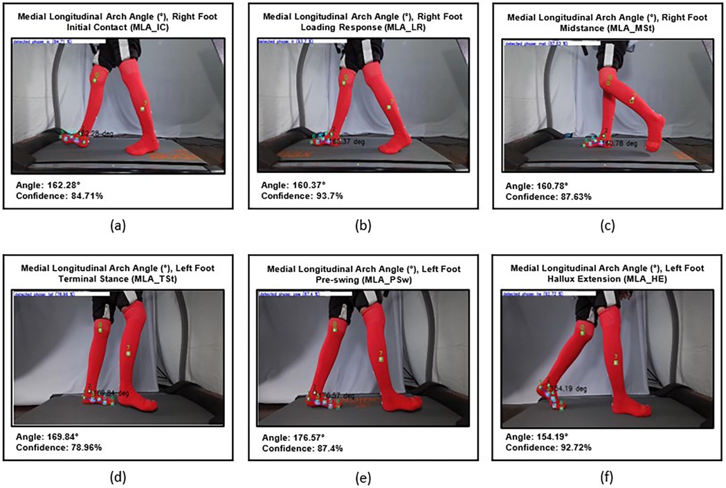 Figure 6. (a) MLA angle on initial stance phase (MLA_IC) of the right foot, (b) mid- loading response (MLA_LR), (c) midstance phase (MLA_MSt), (d) terminal stance phase (MLA_TSt) of the left foot, (e) pre-swing phase (MLA_PSw), and (f) maximal hallux extension (MLA_HE).