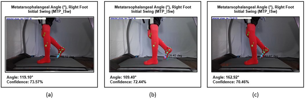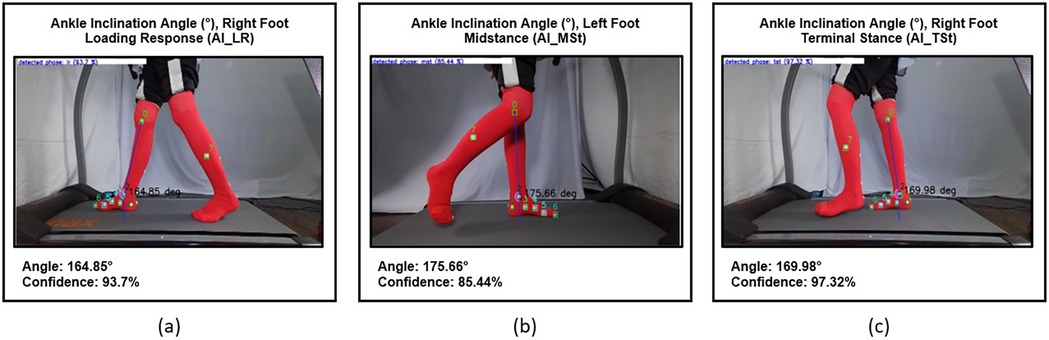 Figure 8. (a) Ankle inclination angle during mid-loading response phase (AI_LR) of the right foot, (b) tibia posterior inclination angle during mid-stance phase (AI_MSt) of the left foot, and (c) tibia anterior inclination angle during terminal stance phase (AI_TSt) of the right foot.