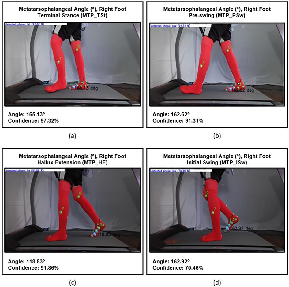 Figure 9. Metatarsophalangeal (MTP) angles of the right foot: (a) at the beginning of terminal stance phase (MTP_TSt), (b) during pre-swing phase (MTP_PSw), (c) prior to toe-off (MTP_HE), and (d) at the onset of initial swing (MTP_ISw).