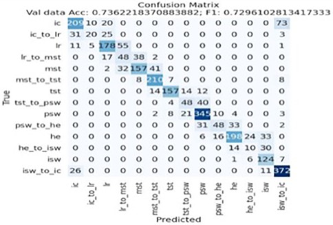 The efficacy of Kinefeet in identifying gait subphases was assessed using a classification model that organizes data into predefined categories. The confusion matrix presented in Figure 10 provides a detailed evaluation of the multi-class classification performance across 14 discrete subphases in the validation dataset. The overall accuracy was 73.6%, with a macro-averaged F1-score of 0.730, suggesting moderate generalizability of the model across categories. However, class-wise analysis indicates several critical misclassification patterns that require attention (Figure 10).