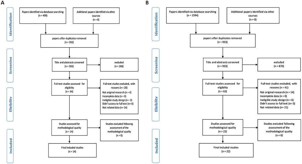 Initially, we obtained 1,594 articles for RA and 409 for CA from three distinct databases, including PubMed, Embase, and Web of Science. Subsequently, we identified and removed duplicates (107 for CA, 661 for RA), leaving us with 302 CA articles and 933 RA articles. Finally, 14 CA studies and 22 RA studies met the inclusion and exclusion criteria and were included in the systematic review (Figures 2A,B, for CA and RA, respectively).