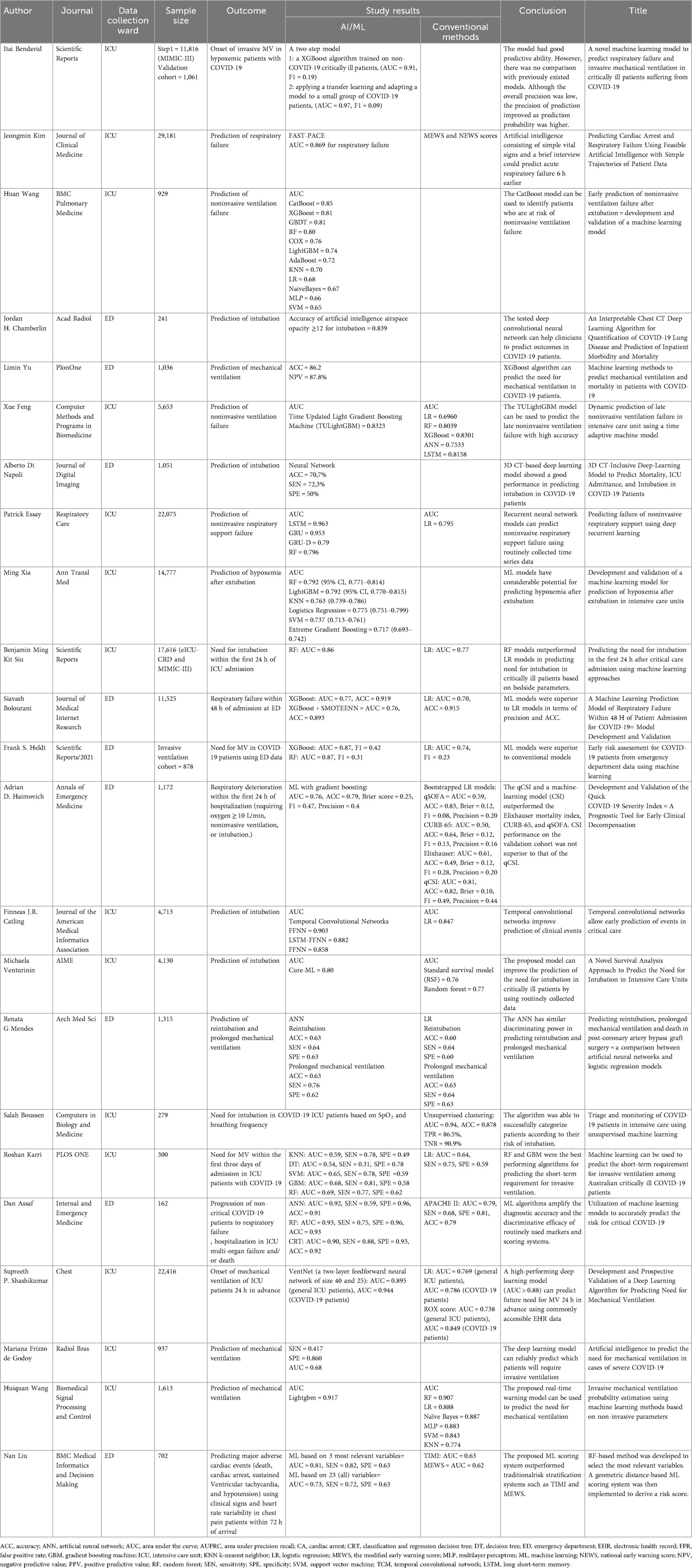 A 3D CT-based deep learning model has also been proposed for the prediction of COVID-19 outcomes, including the need for intubation (49). The prediction results improved when laboratory data were included, while the model accuracy decreased when CT images were excluded (49). A deep convolutional neural network (dCNN) was evaluated to predict inpatient outcomes, including intubation associated with COVID-19 pneumonia (50). Airspace opacity scoring systems, defined by the extent of airspace opacity in each lobe on chest CT scans, were estimated using the deep learning algorithm and used to predict clinical outcomes. Τhe tested algorithm was found to be highly predictive of inpatient outcomes, including intubation (50). De Godoy MF et al., studied the role of CT imaging, assessed by dCNN, in predicting the need for mechanical ventilation in the setting of COVID-19 (51). The high specificity exhibited by the model enabled it to predict which patients may need mechanical ventilation due to COVID-19 infection (51). Bussen S et al., used an unsupervised ML algorithm (the Gaussian mixture model) to predict intubation in COVID-19 patients (52). The algorithm achieved an accuracy of 87.8% for intubation recognition using simple parameters (breathing frequency and SpO2) (52). In addition, XGBoost and Categorical Boosting (CatBoost) algorithms demonstrated high accuracy in predicting the need for mechanical ventilation in COVID-19 patients, using vital signs and demographics for initial triage, in the emergency department (53). In another study, XGBoost and Random Forest outperformed Logistic regression in predicting mechanical ventilation in COVID-19 patients using electronic health records data, in the emergency department (54). Similarly, another study showed that the XGBoost model had the highest mean accuracy for predicting respiratory failure within 48 h of a patient's admission for COVID-19 (55). XGBoost outperformed SMOTEENN XGBoost, Logistic regression, and the Modified Early Warning Score (55). Easily obtained variables were used as inputs including the type of oxygen delivery used in the emergency department, patient age, the Emergency Severity Index level, respiratory rate, serum lactate, and demographic characteristics. In another study, Haimovich AD et al., showed that a bedside ML model (quick COVID-19 Severity Index) that employed 3 variables (respiratory rate, pulse oximetry, and oxygen flow rate), the COVID-19 Severity Index can be used to predict critical respiratory illness in COVID-19 patients (56). These models outperformed the quick Sequential [Sepsis-related] Organ Failure Assessment, CURB-65 and Elixhauser scores. Furthermore, another study showed that ML models (Neural Network, Random Forest, and Classification and Regression Decision Tree) outperformed conventional tools, including the APACHE II score in predicting critical COVID-19 based on clinical parameters on admission (57).
