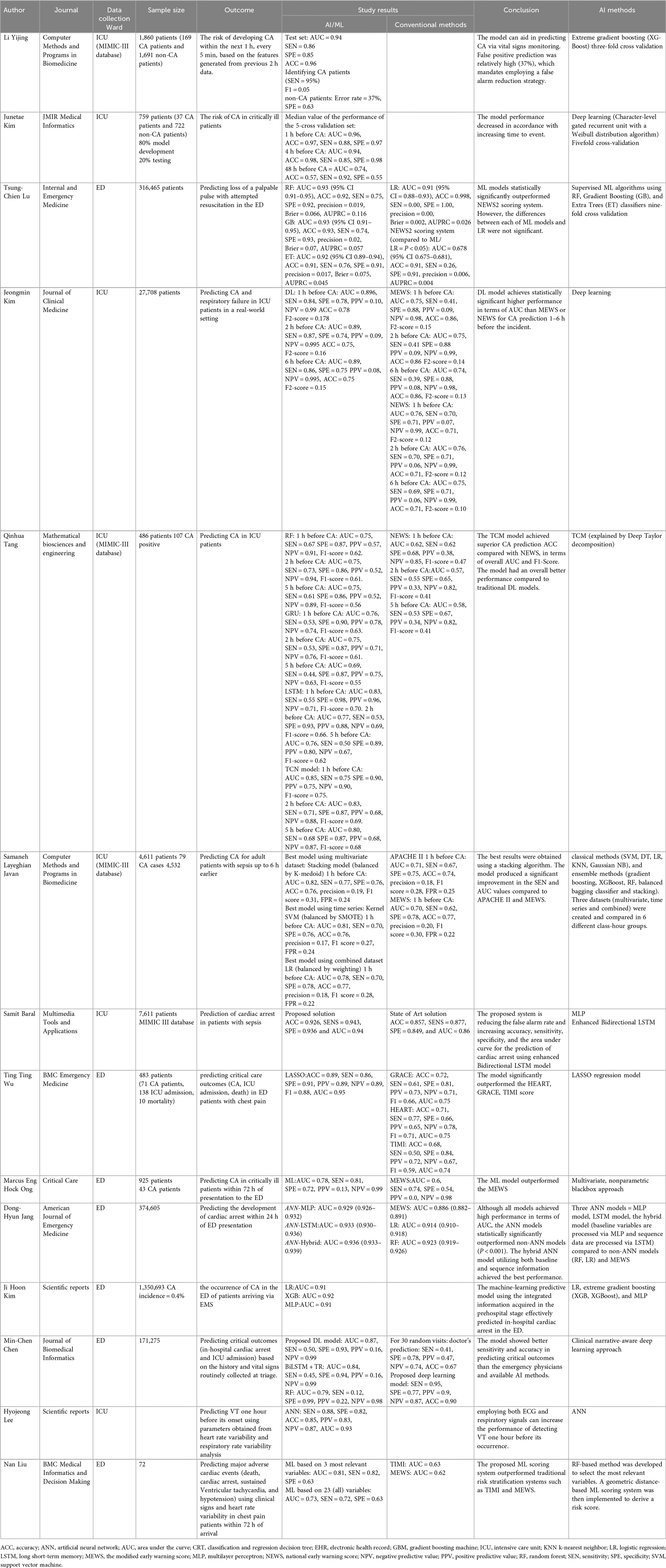 Methods: The study was conducted in compliance with the Preferred Reporting Items for Systematic Reviews and Meta-analyses (PRISMA) framework. PubMed, Embase, and Web of Science without any restriction were searched to extract relevant manuscripts until October 20, 2023. Additionally, the reference list of all potential studies was searched to identify further relevant articles. Original publications were regarded as eligible if they only recruited adult patients (≥18 years of age), employed AI/ML algorithms for predicting cardiac arrest, life-threatening ventricular arrhythmias, and respiratory arrest in the setting of critical care, used data gathered from wards with critically ill patients (ICUs, cardiac ICUs, and emergency departments), and were published in English. The following information was extracted: first author, journal, ward, sample size, performance and features of ML and conventional models, and outcomes.