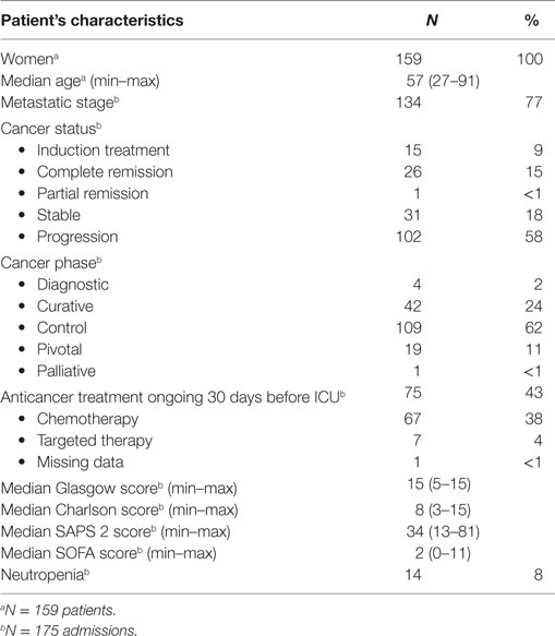 Between January 1, 2009 and December 31, 2014, there were 1586 ICU admissions of whom 282 (18%) concerned patients with breast cancer. Of those 282 patients, 107 were ineligible for the study: therapeutic monitoring (n = 46), planned postoperative monitoring (n = 36), more than one active cancer at the time of admission (n = 19), and other causes (n = 6). Due to multiple admissions in the same patient, 159 patients accounted for the 175 admissions. All admissions were considered for the description of causes of ICU admission but only the first stay in the ICU was considered for hospital mortality and survival after discharge analyses.