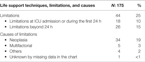 – Treatment limitations distinguishing between preexisting limitations, limitations occurring during the first 24 h after ICU admission and limitations occurring after 24 h in the ICU. We determined the reasons for these limitations: neoplasia, multifactorial (including a neoplastic cause, treatment complication, and/or infectious complication), and other reason.