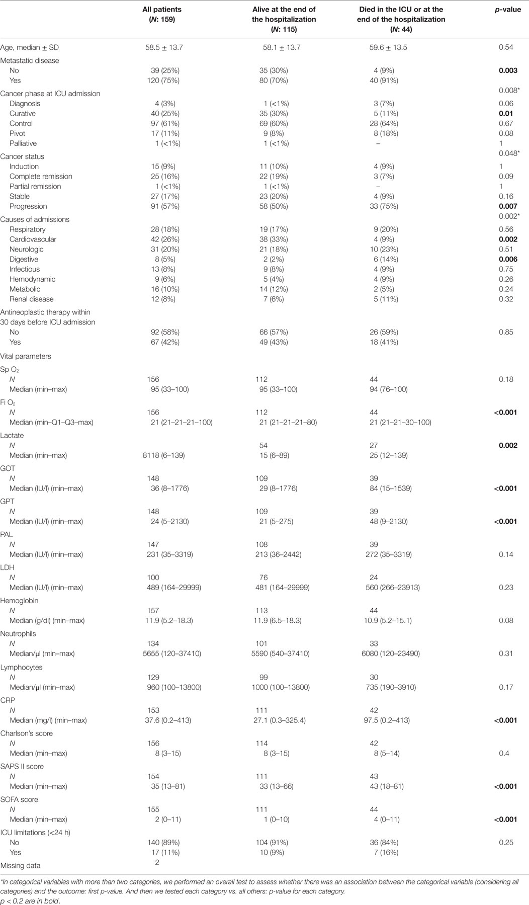 Table 4. Univariate analysis for hospital mortality of breast cancer patients admitted in the ICU (N = 159).
