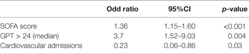 In multivariate analysis, we found three statistically independent predictors of death during hospitalization: SOFA score (OR 1.36 per one-unit increase, 95% CI: 1.15–1.60; p < 0.001), and GPT above the median value (OR 3.7, 95% CI: 1.52–9.03, p = 0.004) as predictive factors of poor outcome, while cardiovascular disease as cause of the admission (OR 0.23, 95% CI: 0.06–0.86, p = 0.03) being a predictive factor of better outcome (Table 5).