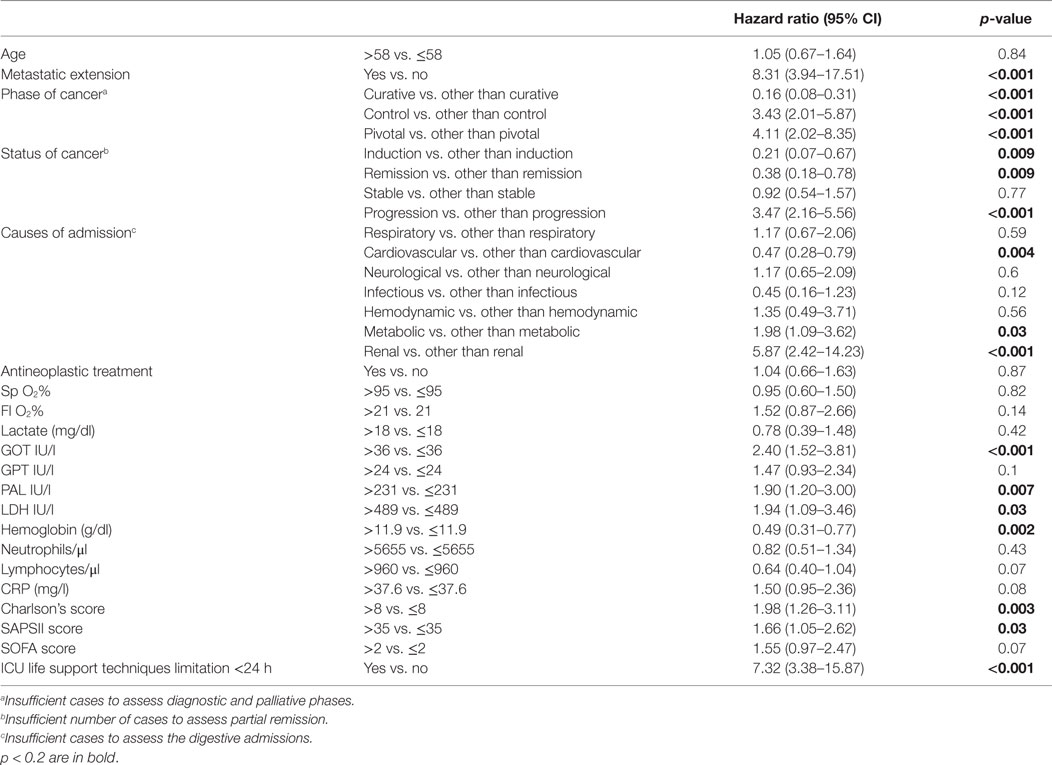 We confirmed the findings from previous publications that cancer characteristics retained their prognostic value for survival after hospital discharge, identifying in the present study metastatic disease as an independent prognostic factor. Indeed, a relationship was reported between the metastatic cancer extent and the hospital mortality (3, 10, 14).