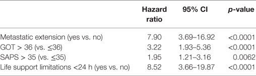 During the study period, 115 patients were discharged from the hospital. Median survival after hospital discharge was 12.8 months (95% CI: 8.2–20.7). Table 6 shows the results of the univariate analyses for prognostic factors for survival after hospital discharge. The following variables were significantly associated with survival in univariate analyses: metastatic disease, cancer phase at ICU admission, cancer status, GOT, PAL, hemoglobin and lactate dehydrogenase (LDH) levels, SAPSII and Charlson scores, ICU life support limitations <24 h; in addition to those, we added in the multivariate model the variables with a p-value <0.2: Fi O2, GPT, and CRP levels, SOFA score, lymphocytes count. In multivariate analysis (Table 7), we found four statistically independent prognostic factors for survival after hospital discharge: metastatic disease (HR 7.9, 95% CI:3.69–16.9, p < 0.001), GOT above the median value (HR 3.22 95% CI:1.93–5.36, p < 0.001), SAPS score above the median value (HR 1.95 95% CI:1.21–3.16, p = 0.006), and ICU life support limitations at or during the first 24 h of ICU admission (HR 8.52 CI 95%:3.66–19.87, p < 0.001).