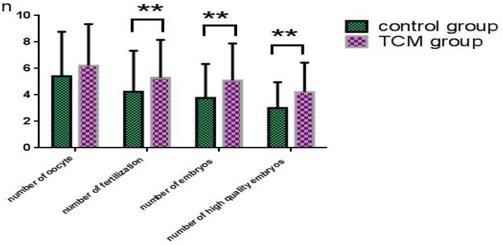 The data on embryo quality in the control and experimental groups are presented in Figure 2. The number of oocytes in the TCM experimental group (6.2 ± 3.1) was higher than that of the control group (5.4 ± 3.4), even though the difference was not statistically significant (P > 0.05). The fertilization rate in the TCM experimental group was significantly higher than that of the control group, and so was the number of embryos in the TCM experimental group (5.1 ± 2.8) vs. the control group (3.8 ± 2.6) (P < 0.01 in both cases). Additionally, the number of high-quality embryos (4.2 ± 2.2) was also significantly higher than that of the control group (3.0 ± 2.0) (P < 0.01).