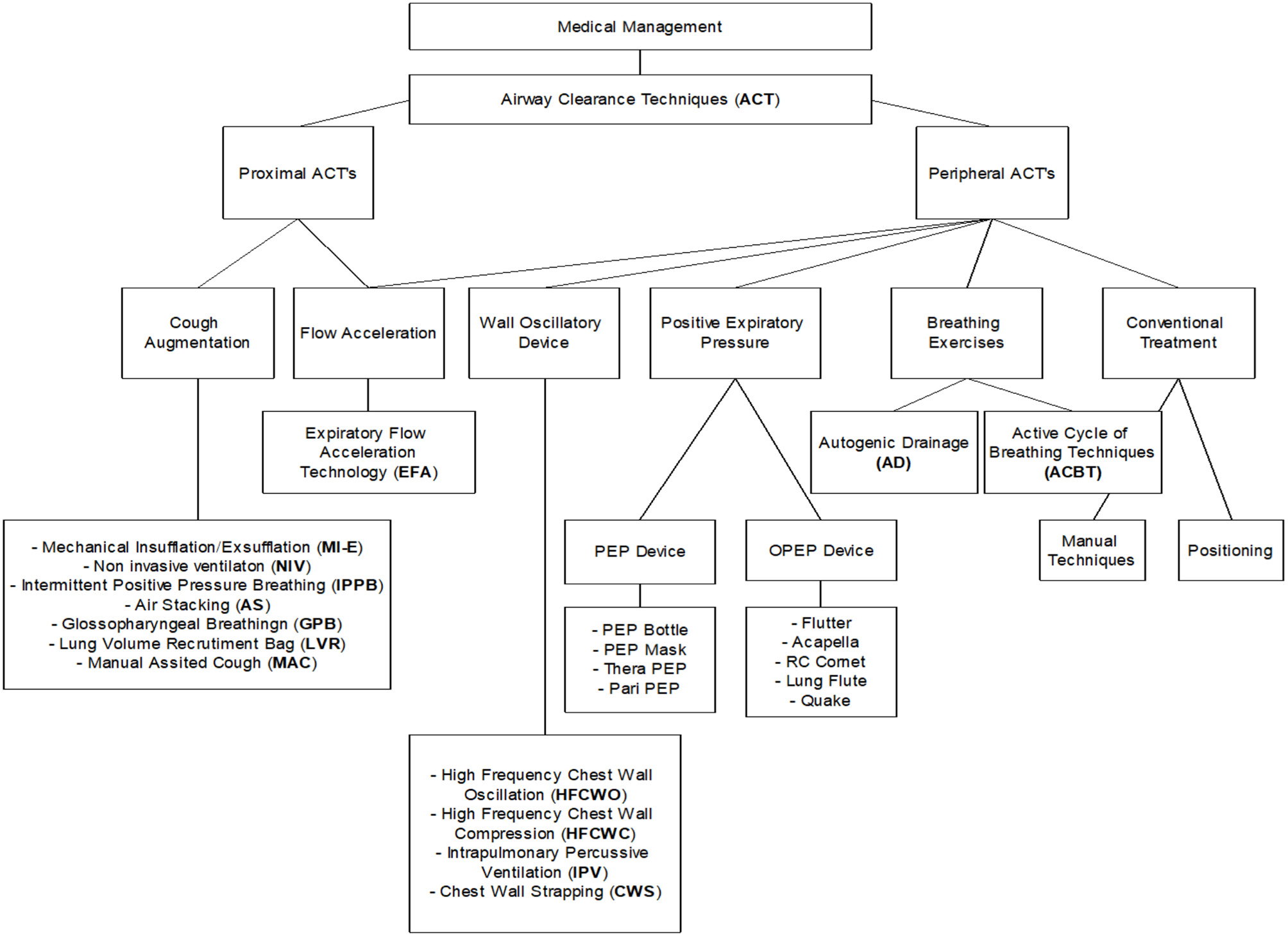 The management of bronchial secretions is one of the main problems encountered in a wide spectrum of medical conditions ranging from respiratory disorders, neuromuscular disorders and patients undergoing either thoracic or abdominal surgery. The purpose of this review is illustrate to the reader the different ACTs currently available and the related evidence present in literature. Alongside methods with a strong background behind as postural drainage, manual techniques or PEP systems, the current orientation is increasingly aimed at devices that can mobilize and / or remove secretions. Cough Assist, Vacuum Techniques, systems that modulate airflow have more and more scientific evidence. Different principles combination is a new field of investigation that goes toward an increasing of clinical complexity that will facing us.